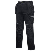 UPF rating 50+. Two way stretch fabric. Part elasticated waistband with high rise back. Belt loops. Zip fly with button over. D-ring. Two holster pockets. Two side pockets. Two rear pockets, right with tear release flap. Left leg multi-use pocket. Hammer loop. Double ruler pocket. Top loading knee pad pockets - knee pads included. Adjustable leg length reg 31" to tall 33". Reinforced panels in high wear areas. Triple stitched seams. Contrast stitching.